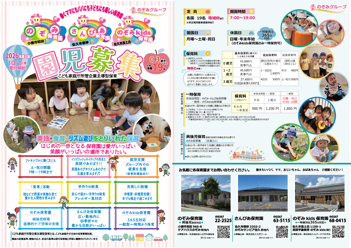 2026年度入園募集について 2025年10月1日(水)より受付を開始いたします。 ご希望の方は各園に電話でお問い合わせください。 ・のぞみ保育園 小諸市和田966-8 電話 0267-22-2525 ・さんぴあ保育園 佐久市根岸3203-2 電話 0267-63-5115 ・のぞみkids保育園 佐久市長土呂1199-1 電話 0267-68-0415 入園申込書を記入して各保育園へお申し込みください。 ~入園のご案内~ ご案内はこちらです