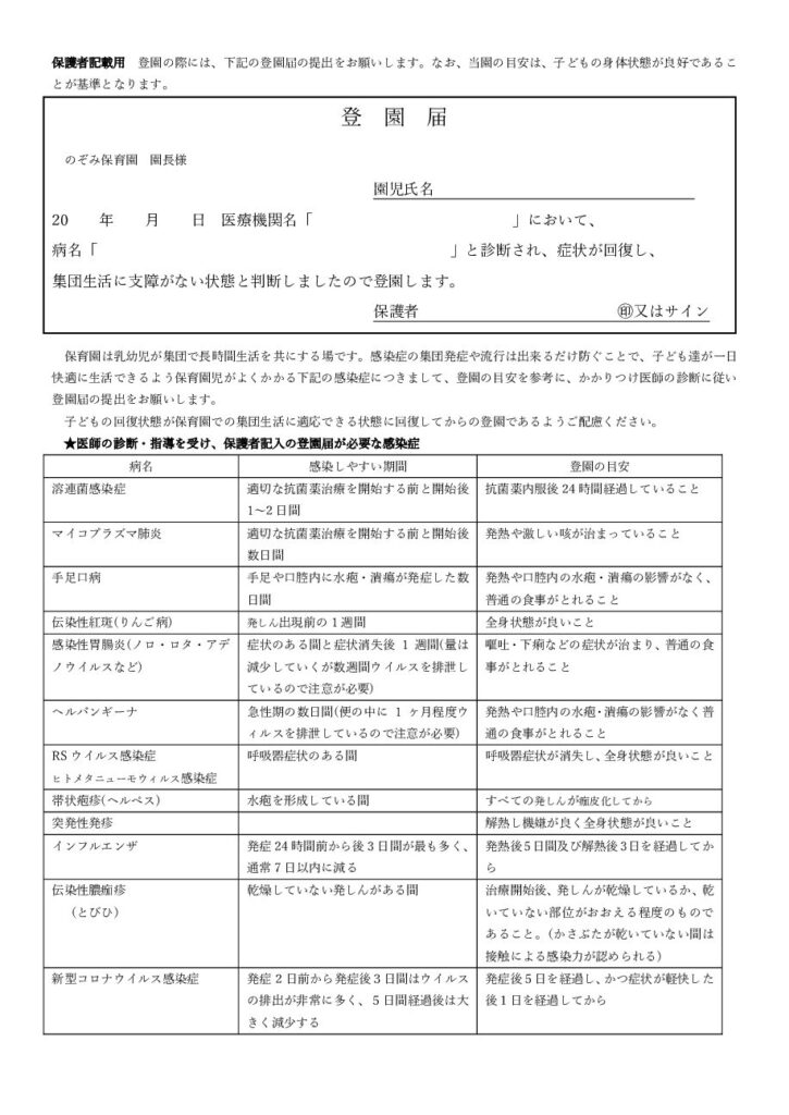 のぞみ保育園 登園届